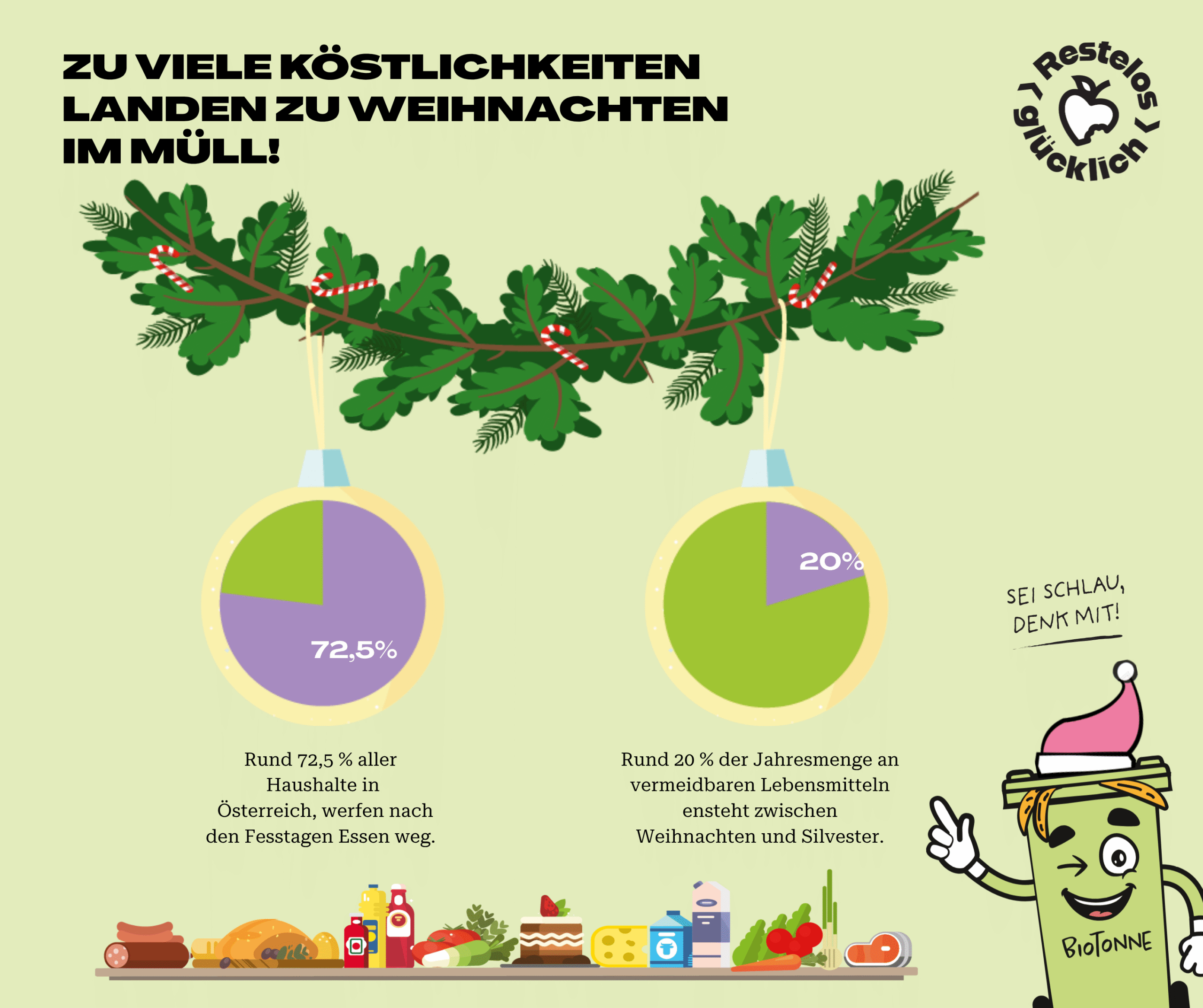 An Weihnachten sind die Tische meist reich gedeckt, denn gemeinsam zu genießen gehört in den Feiertagen einfach dazu. Kein Wunder, dass rund 72,5 Prozent der Haushalte in Österreich nach den Weihnachtsfeiertagen Lebensmittel wegwerfen. Ein Fünftel aller vermeidbaren Lebensmittelabfälle fallen in Österreich zwischen Weihnachten und Neujahr an.